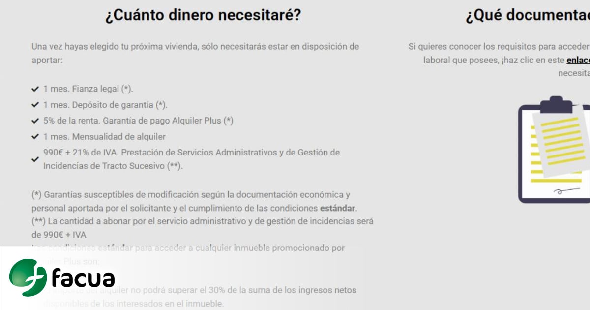 La empresa obliga a la contratación de "servicios administrativos y de gestión de incidencias" y al pago del 5% de la renta como "garantía de pago Alquiler Plus".